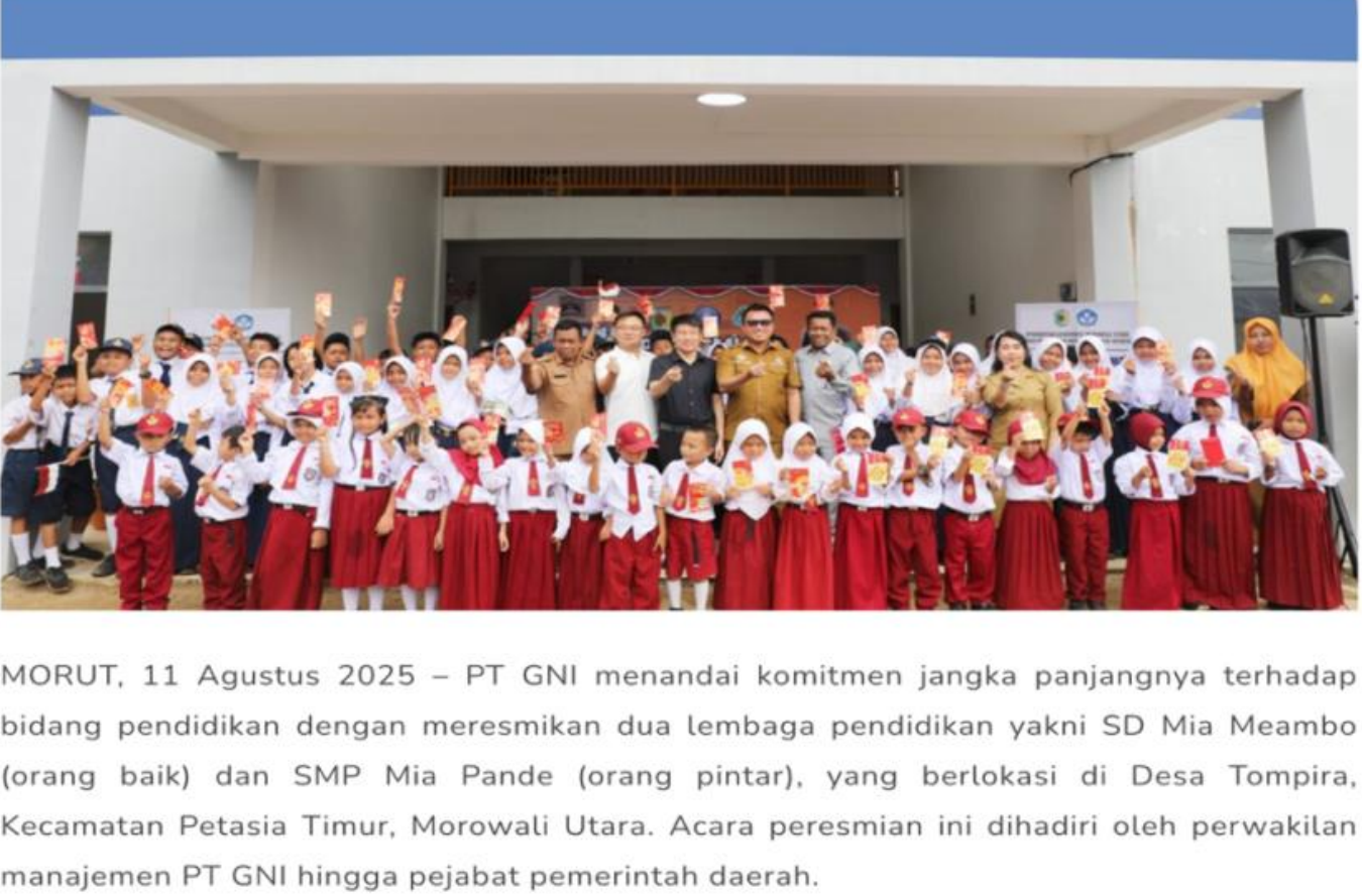 jangka panjangnya di bidang pendidikan. Sekolah-sekolah tersebut, SD Mia Meiambo (yang berarti "Baik") dan SMP Mia Pande (yang berarti "Cerdas"),akandialihfungsikanmenjadi pusatpendidikanvokasiyangluas, menawarkanberagamkursusdan pelatihanuntuk mempersiapkantenaga kerja lokal menghadapi tuntutan yang terus berkembang. Atas nama pemerintah daerah, Bupati Morowali Utara, Gubernur Delilis, menyampaikan rasa terima kasih yang tulus kepada PT. GNI, dan menyatakan bahwa hal ini merupakan kontribusi positif dari investasi perusahaan terhadap pembangunan daerah. Beliau juga menekankan: "Ini merupakan perwujudan visi bupati untuk membangun pusat pendidikan guna mempersiapkan generasipenerus yang lebih baik bagi Morowali Utara."